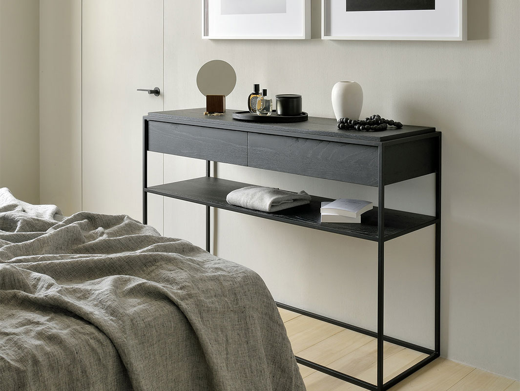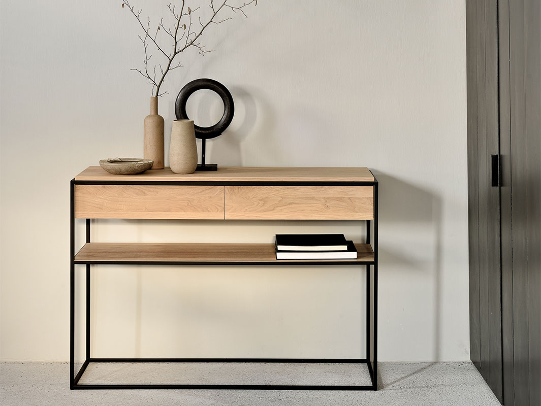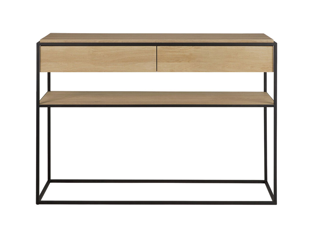Consola Monolit de Ethnicraft en roble macizo con marco de metal negro y 2 cajones. Diseño minimalista.