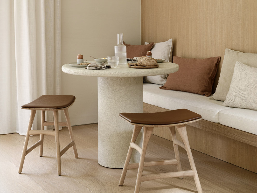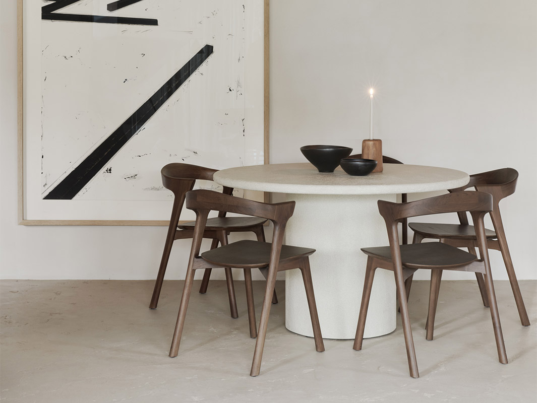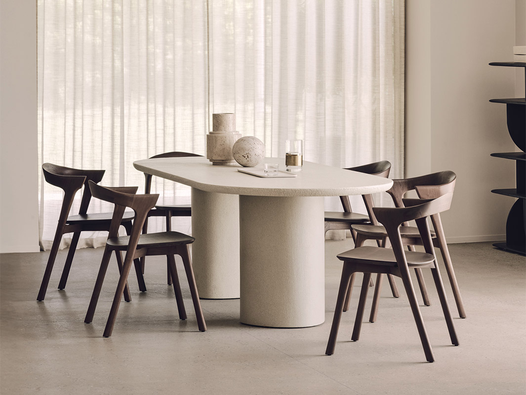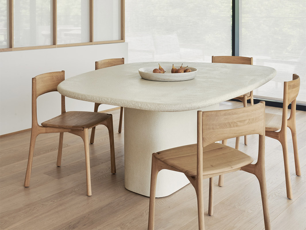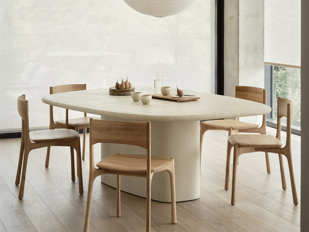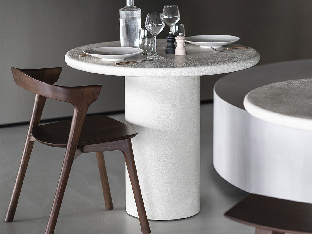 La Mesa Elements de Ethnicraft se caracteriza por su elegante sencillez y su marcada presencia escultórica. Cada pieza está elaborada artesanalmente con un acabado de microcemento mineral, que aporta una textura fina, ligeramente terrosa y una estética contemporánea muy equilibrada.