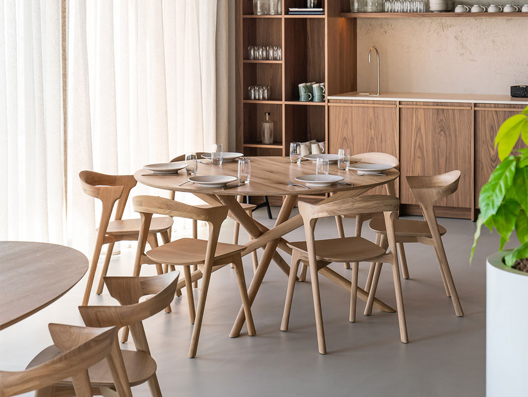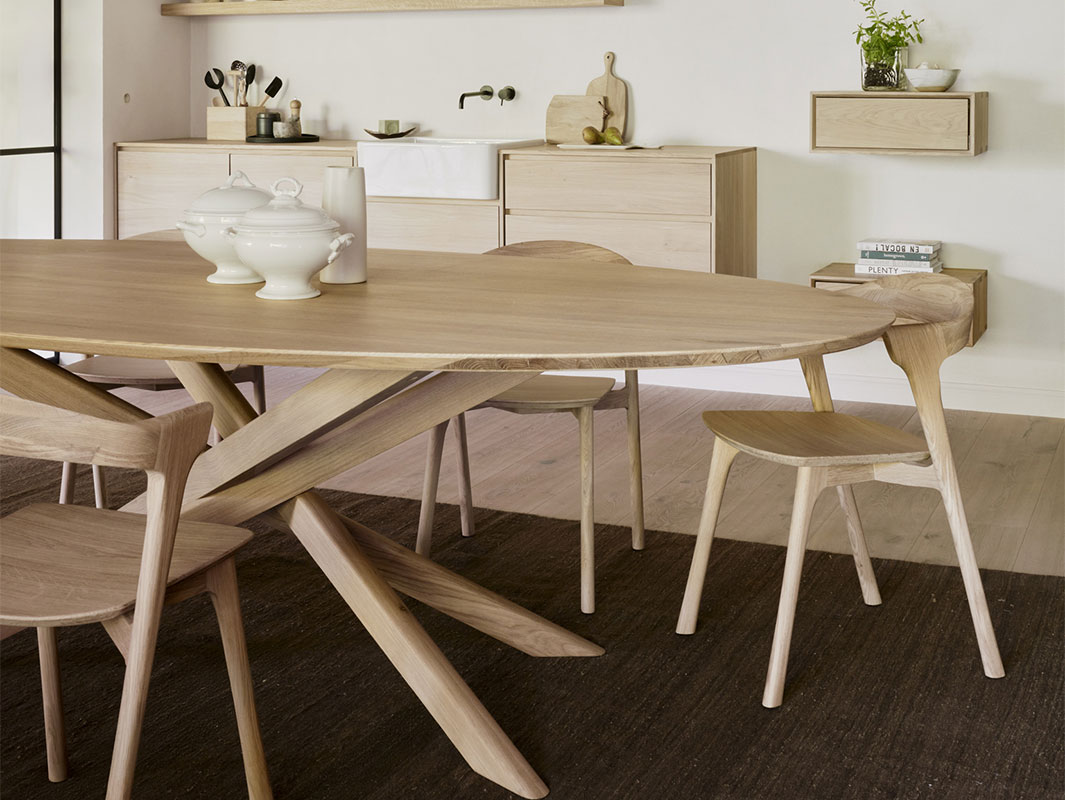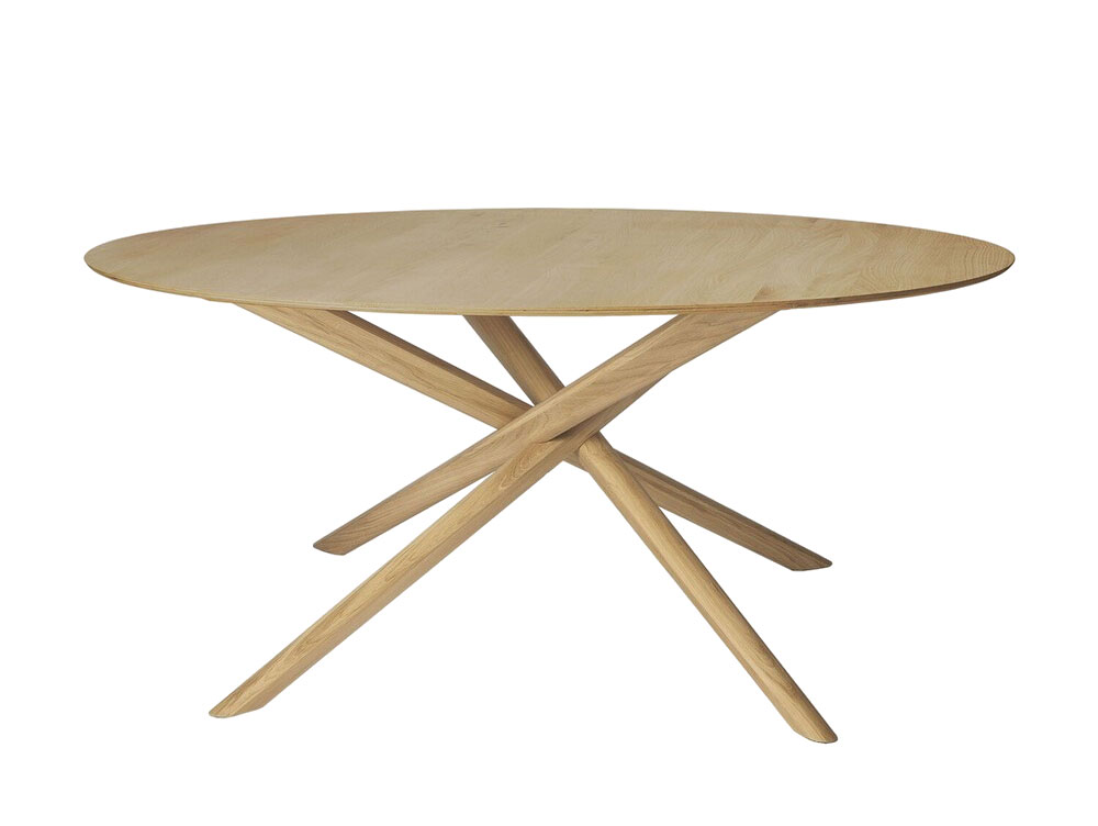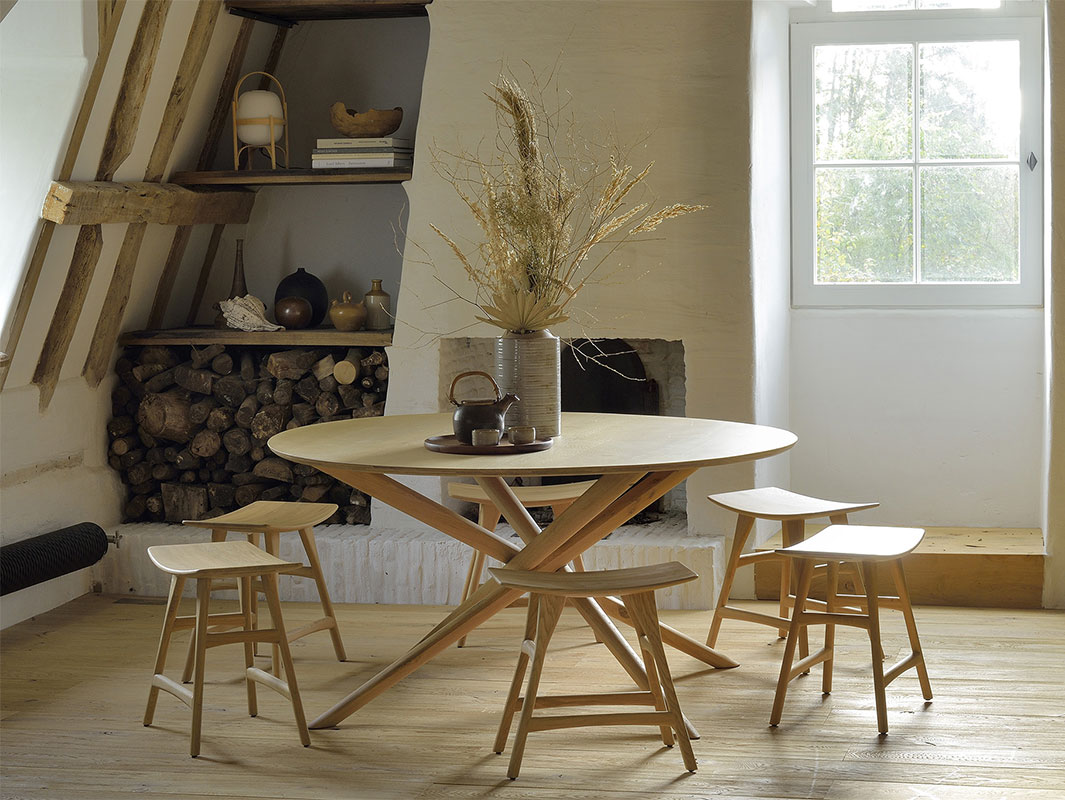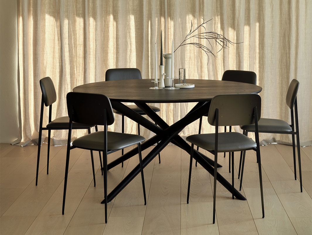 La colección Mikado está disponible en versiones redonda, ovalada y cuadrada, permitiendo elegir el formato adecuado según las necesidades del espacio. Las patas, con un diseño robusto pero visualmente ligero, aportan estabilidad y sofisticación a la mesa. Además, el acabado natural de la madera pone en valor las vetas y la textura del roble, aportando calidez y un toque orgánico a la decoración.