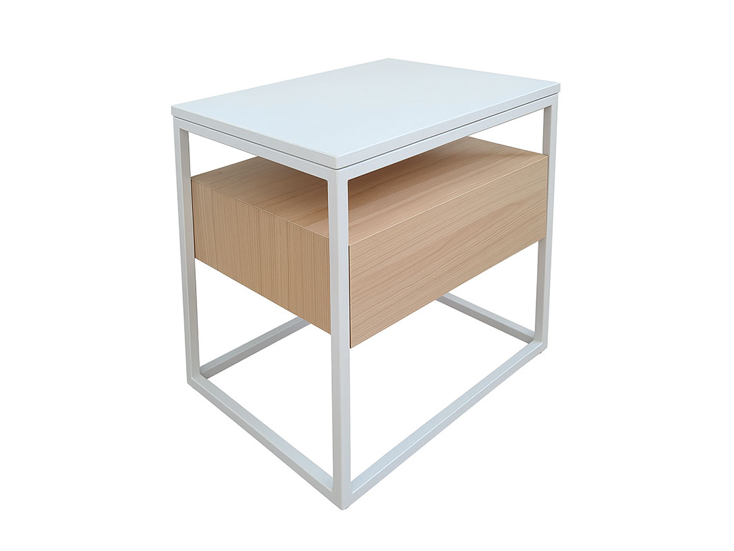 Su estructura abierta en metal lacado aporta ligereza visual, mientras que el cajón suspendido en madera añade calidez y espacio de almacenaje práctico. La fabricación a medida permite ajustar sus proporciones, acabados y colores, lo que convierte a la mesilla Altea en una solución versátil para proyectos personalizados.